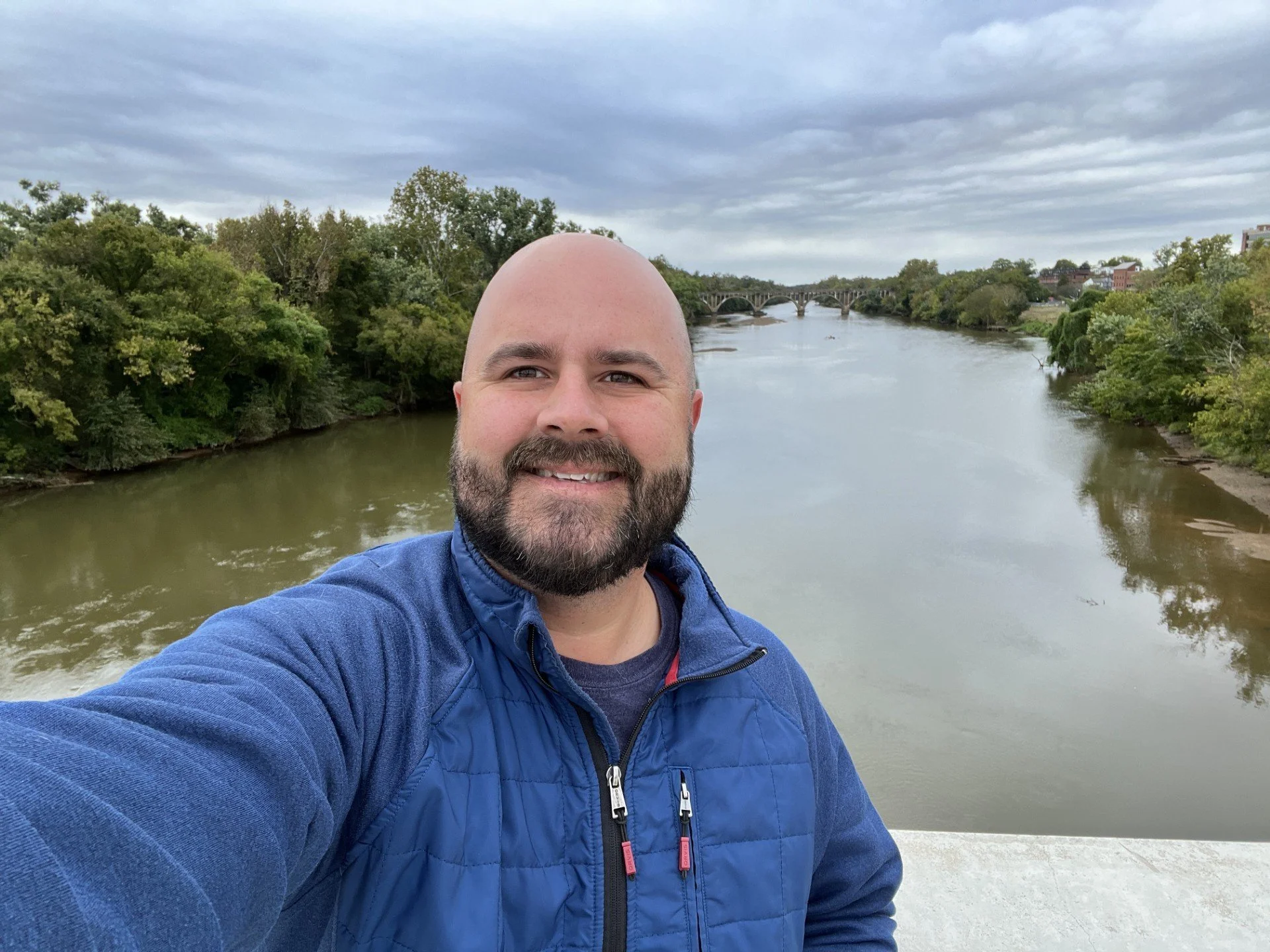 A man with a beard taking a selfie on a bridge over a river, surrounded by green trees, with a cloudy sky in the background.