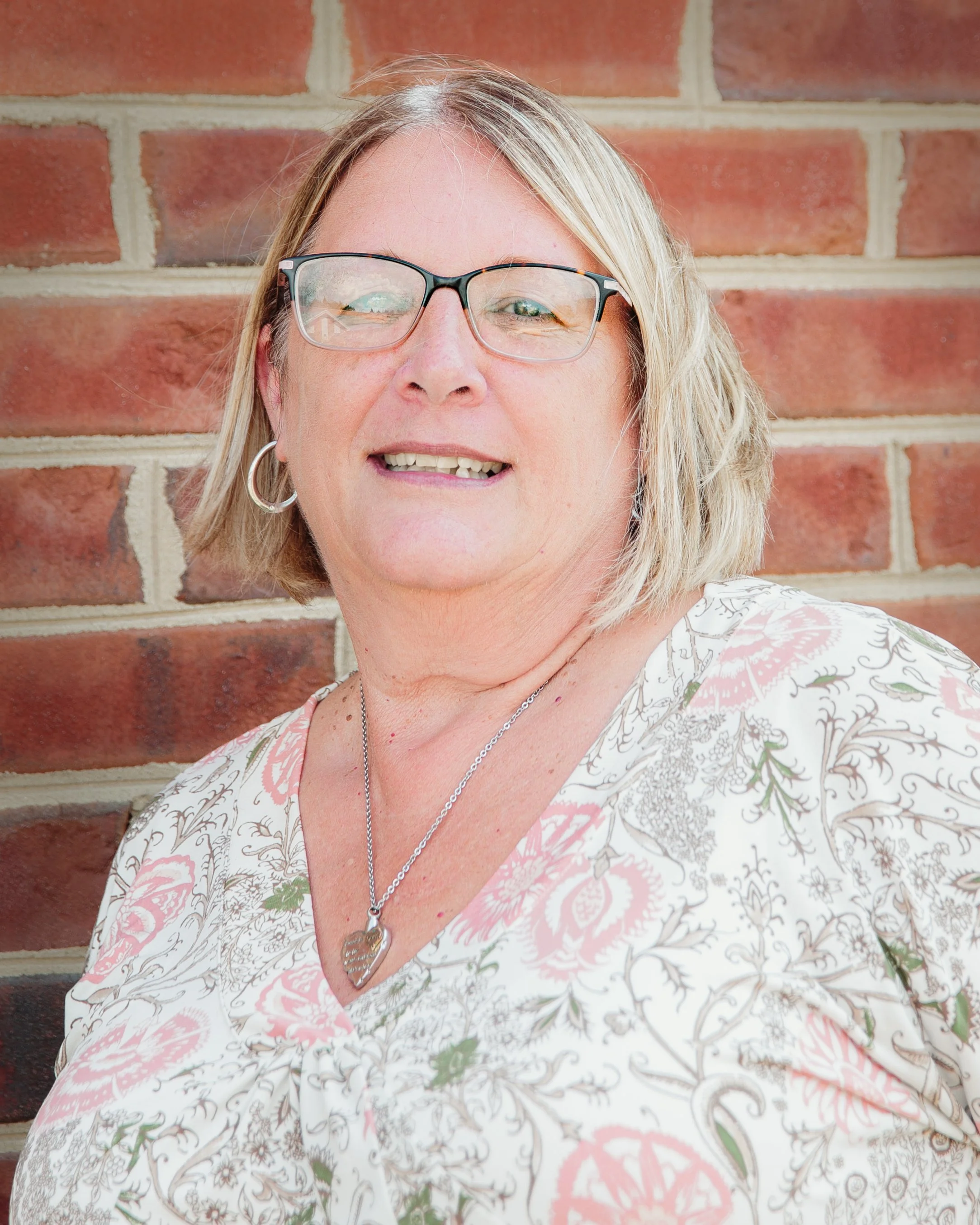 A woman with short brown hair, glasses, and a broad smile is standing in front of a brick wall. She is wearing a light blue blouse with a dark blue floral pattern.