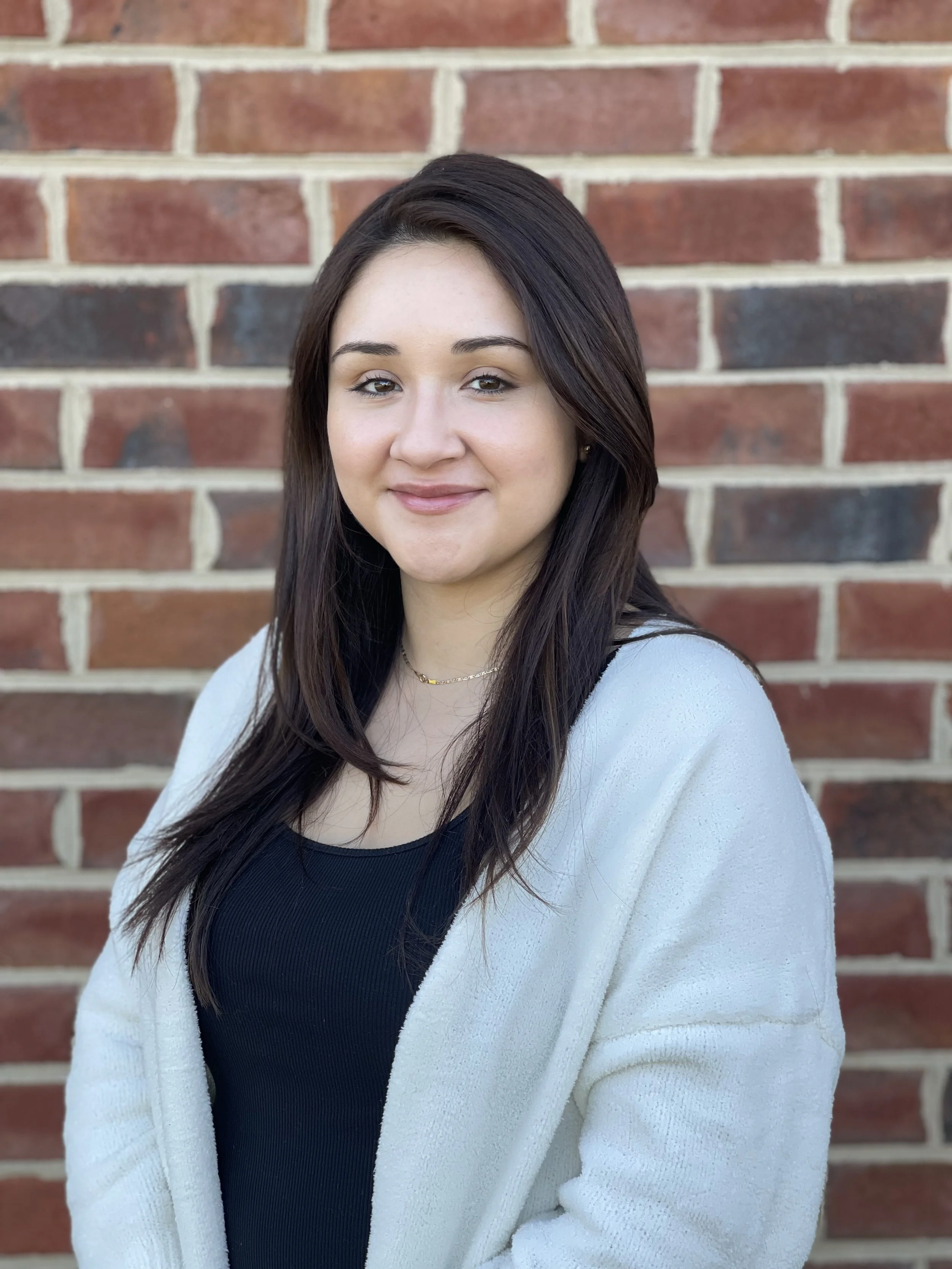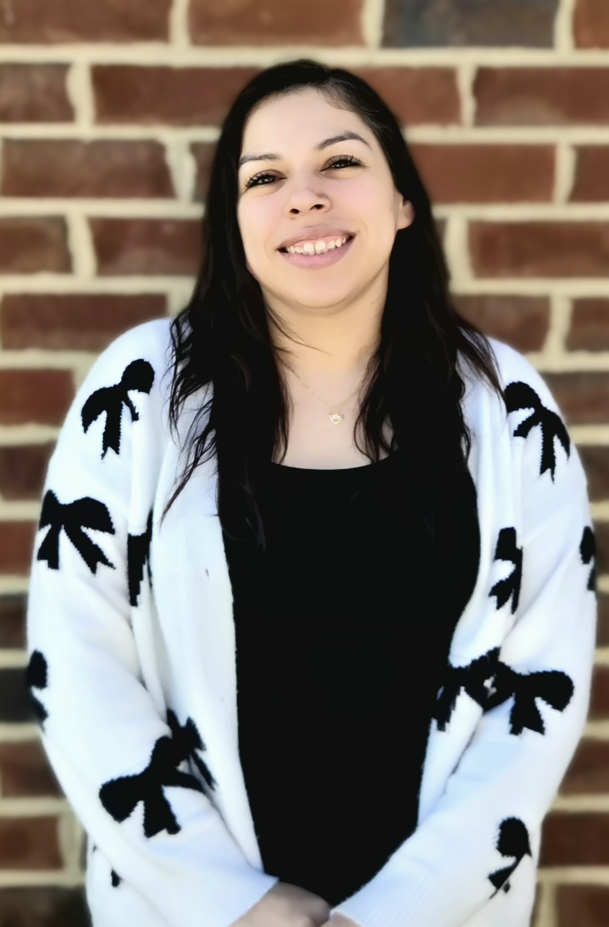 A young woman with long dark hair, wearing a white cardigan and a black top, standing in front of a brick wall, smiling softly at the camera.