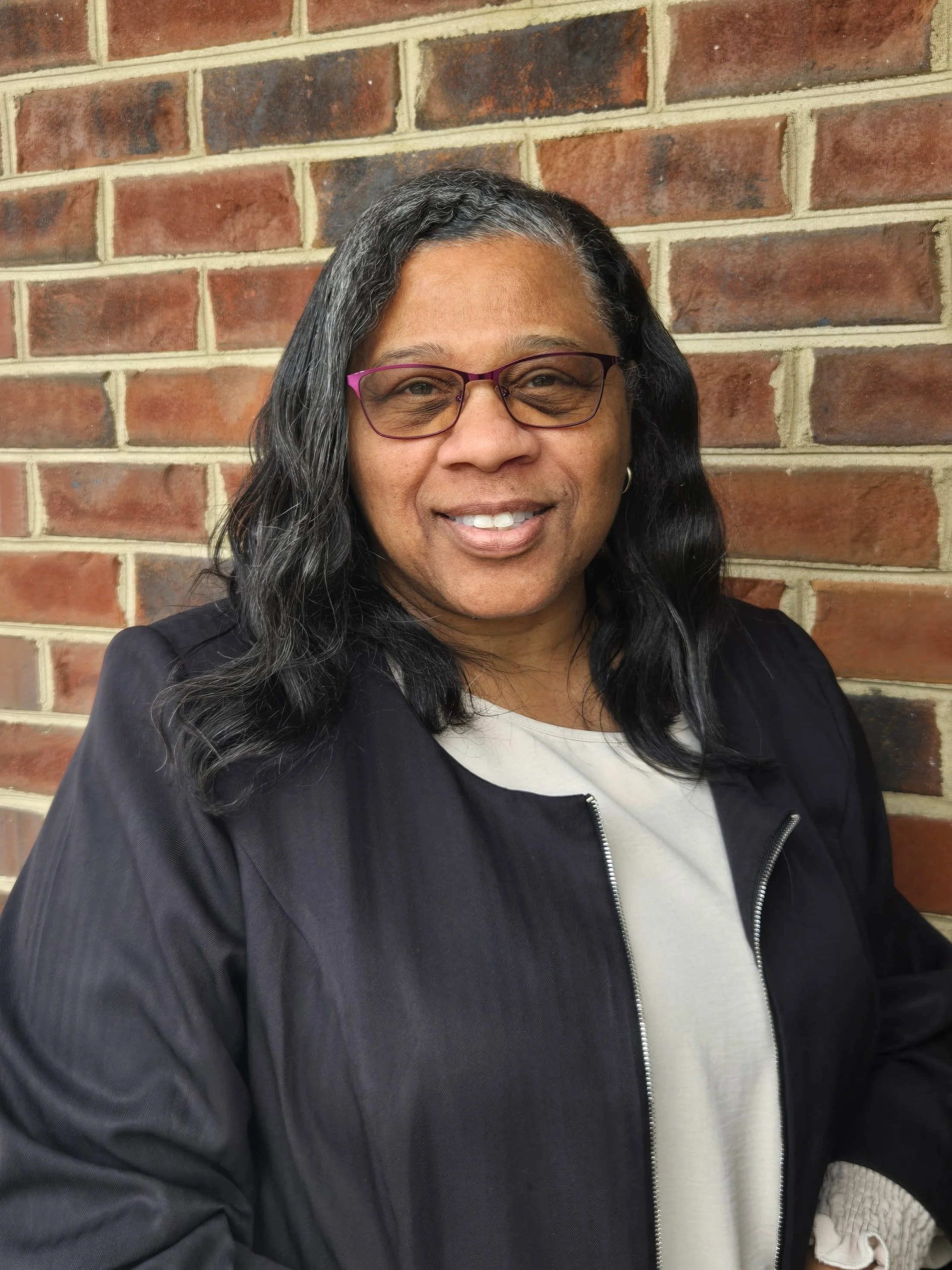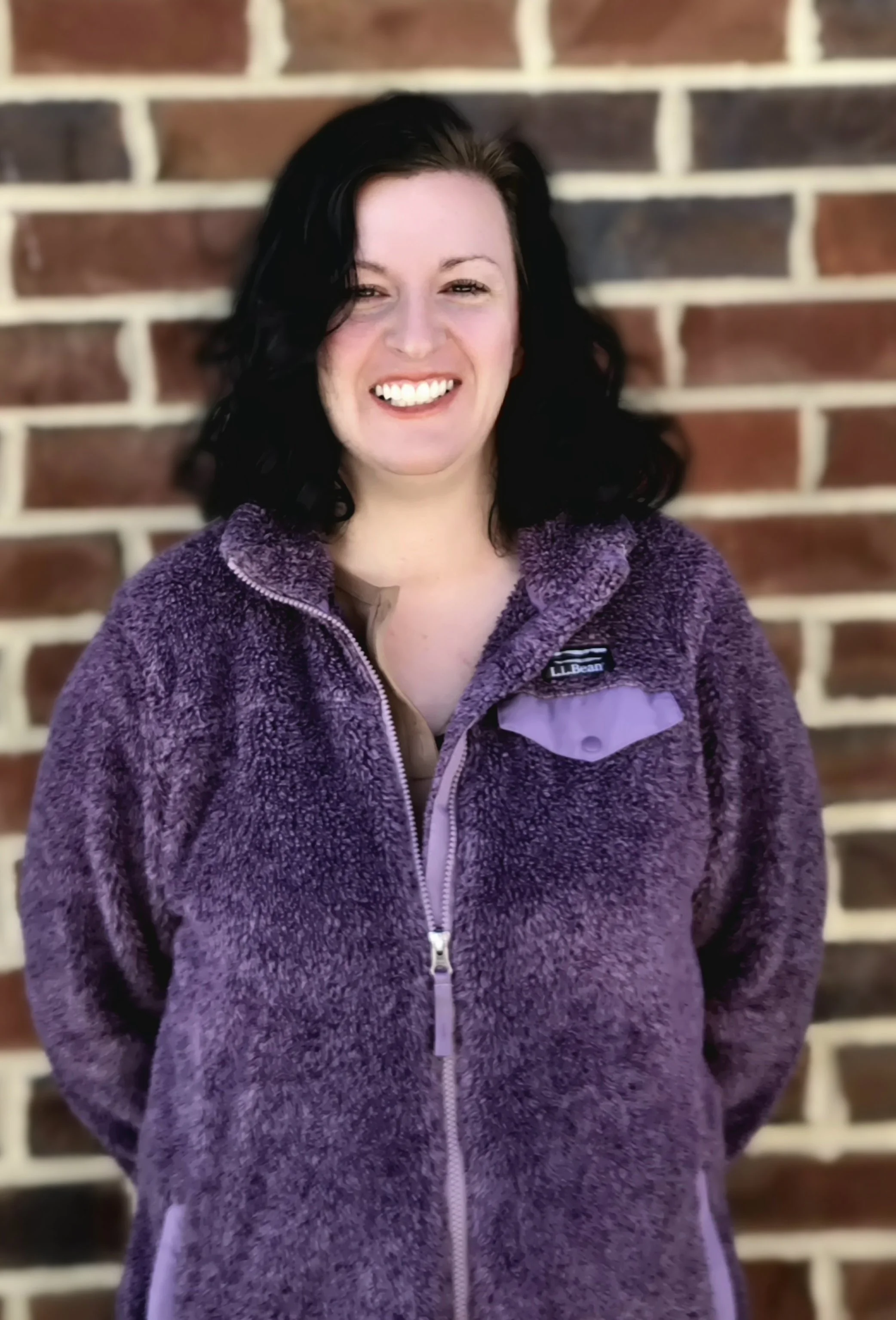 A woman with shoulder-length wavy black hair, wearing purple glasses, a light-colored top, and a black jacket, smiling and standing against a brick wall.