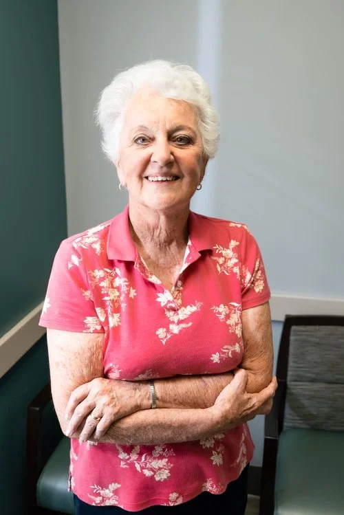An elderly woman with white hair, wearing a pink floral polo shirt, smiling with arms crossed in a room with teal and light-colored walls.