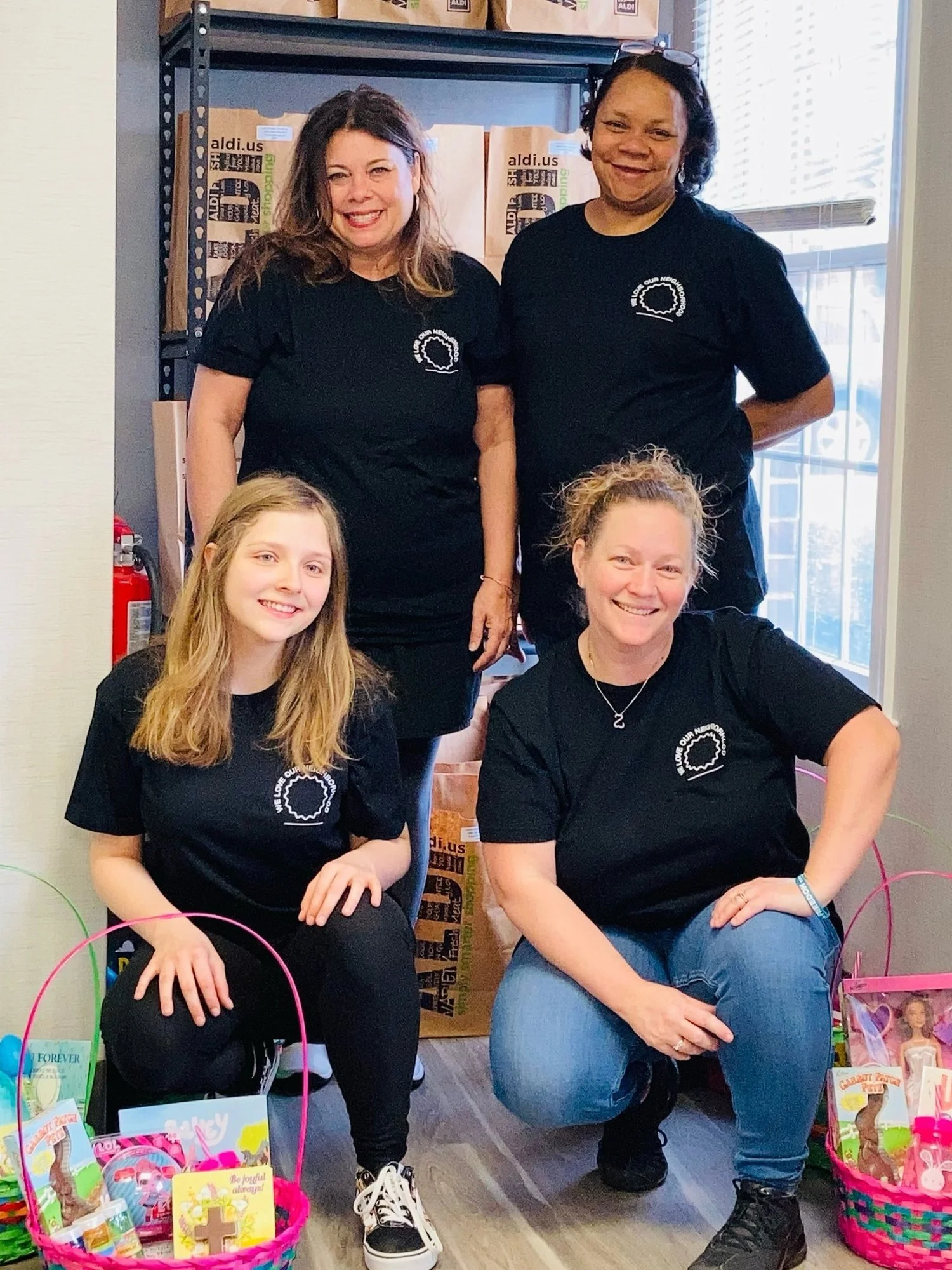 Four women in black shirts with a logo pose with gift baskets inside a room near a window and a shelving unit stocked with boxes.